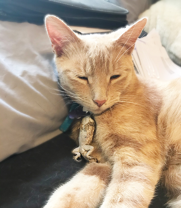100% True Story: One time my cat, Fry, caught a lizard and somehow got it stuck in his collar. He just accepted it and snuggled up to take a nap, which allowed me to snap this infamous photo: